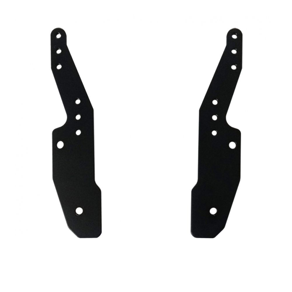 Fabricado em chapa de aço carbono 3,75 mm de espessura com acabamento em preto fosco epoxi. Seu formato reto mantém o ângulo do suporte original da moto e suas furações permitem uma variação de altura de 7,4 cm até 12 cm, além das regulagens do suporte original.